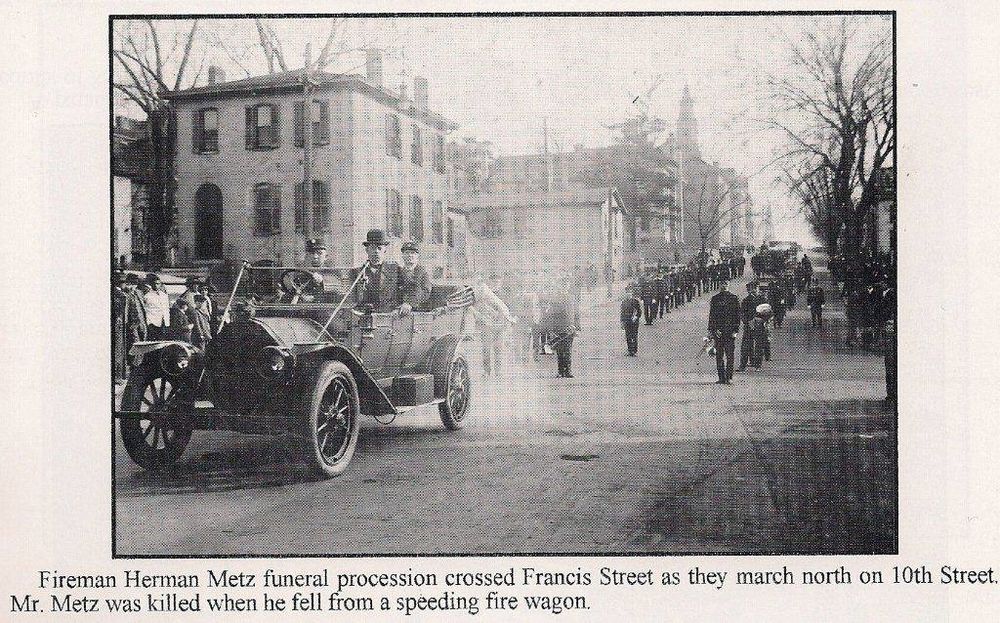 As he was driving to a fire, Firefighter Metz leaned over to touch one of the horses with his whip and fell from his seat as he lost his balance. Holding onto the lines, he managed to get the horses to stop. However while one of the horses was backing up, it stepped on his chest causing the injuries that resulted in his death.